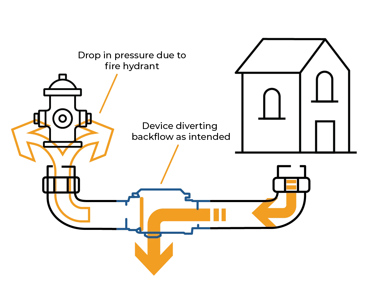 Typically, water will flow from the public water supply to the consumer’s plumbing distribution system. Backflow is the undesirable reversal of this flow of water and undesirable substances from the non-potable source to the potable source.